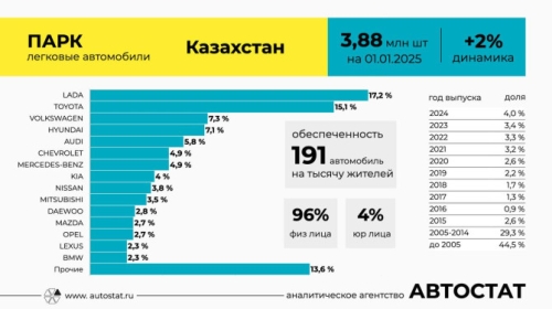 По данным агентства «АВТОСТАТ», на 1 января 2025 года в Казахстане на учете стояло 3,88 млн легковых машин. Эксперты агентства отмечают, что за год этот показатель вырос на 2%.